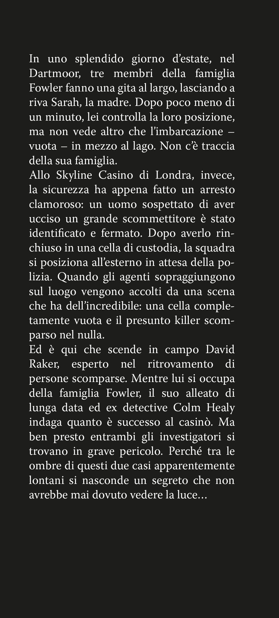 Ed è qui che scende in campo David Raker, esperto nel ritrovamento di persone scomparse. Mentre lui si occupa della famiglia Fowler, il suo alleato di lunga data ed ex detective Colm Healy indaga quanto è successo al casinò. Ma ben presto entrambi gli investigatori si trovano in grave pericolo. Perché tra le ombre di questi due casi apparentemente lontani si nasconde un segreto che non avrebbe mai dovuto vedere la luce…