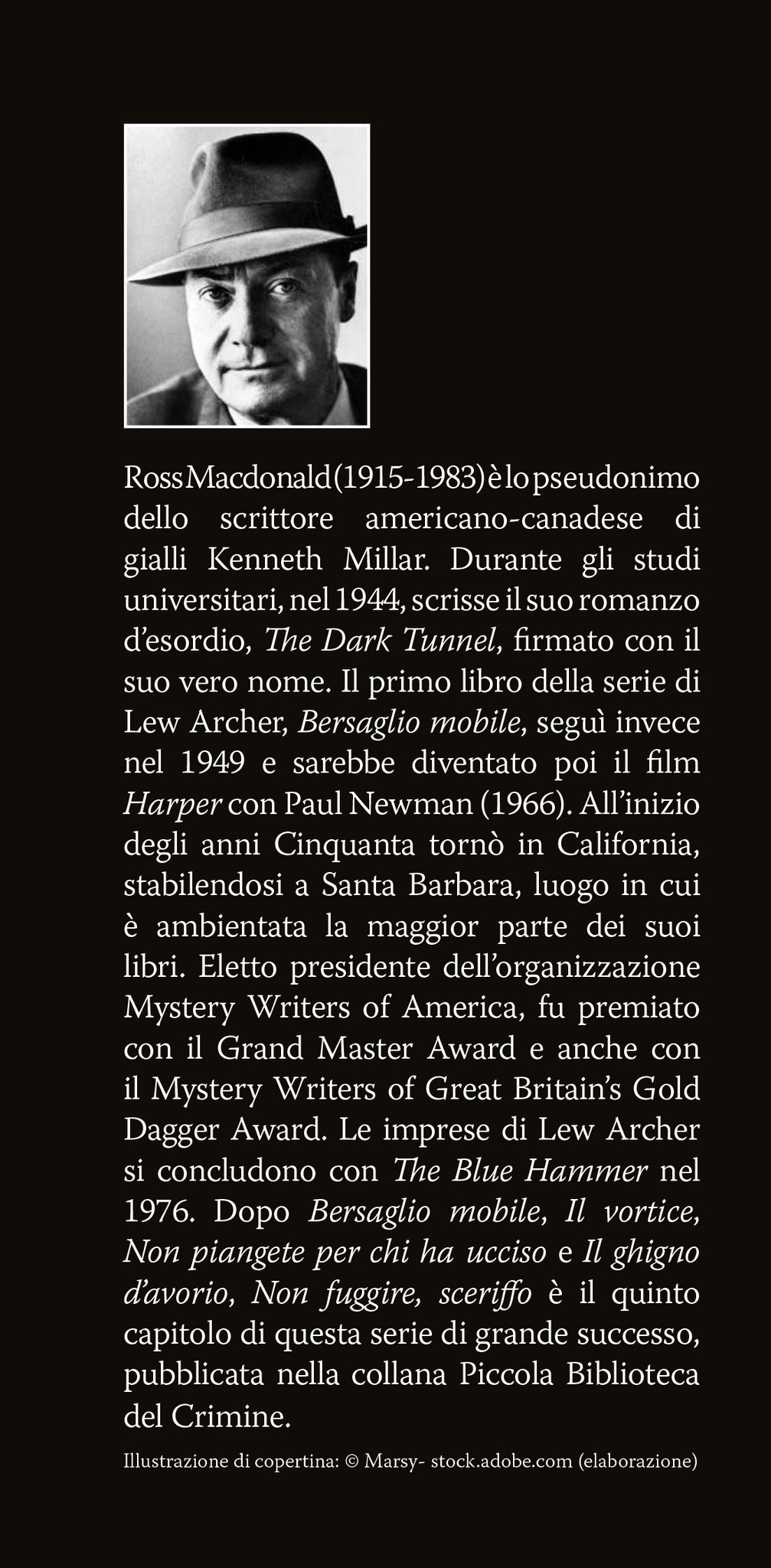Ross Macdonald (1915-1983) è lo pseudonimo dello scrittore americano-canadese di gialli Kenneth Millar. Durante gli studi universitari, nel 1944, scrisse il suo romanzo d’esordio, The Dark Tunnel, firmato con il suo vero nome. Il primo libro della serie di Lew Archer, Bersaglio mobile, seguì invece nel 1949 e sarebbe diventato poi il film Harper con Paul Newman (1966). All’inizio degli anni Cinquanta tornò in California, stabilendosi a Santa Barbara, luogo in cui è ambientata la maggior parte dei suoi libri. Eletto presidente dell’organizzazione Mystery Writers of America, fu premiato con il Grand Master Award e anche con il Mystery Writers of Great Britain’s Gold Dagger Award. Le imprese di Lew Archer si concludono con The Blue Hammer nel 1976. Dopo Bersaglio mobile, Il vortice, Non piangete per chi ha ucciso e Il ghigno d’avorio, Non fuggire, sceriffo è il quinto capitolo di questa serie di grande successo, pubblicata nella collana Piccola Biblioteca del Crimine.