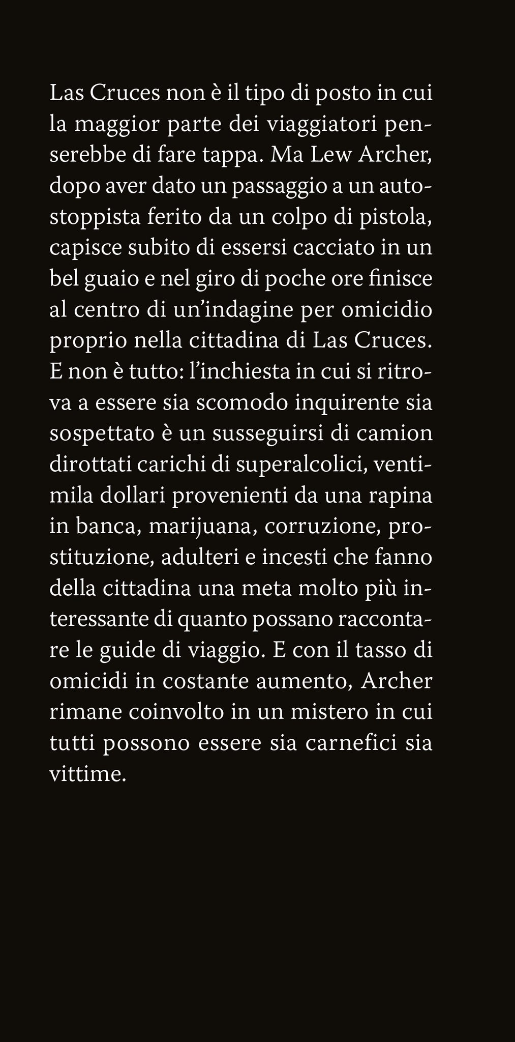 Las Cruces non è il tipo di posto in cui la maggior parte dei viaggiatori penserebbe di fare tappa. Ma Lew Archer, dopo aver dato un passaggio a un autostoppista ferito da un colpo di pistola, capisce subito di essersi cacciato in un bel guaio e nel giro di poche ore finisce al centro di un’indagine per omicidio proprio nella cittadina di Las Cruces. E non è tutto: l’inchiesta in cui si ritrova a essere sia scomodo inquirente sia sospettato è un susseguirsi di camion dirottati carichi di superalcolici, ventimila dollari provenienti da una rapina in banca, marijuana, corruzione, prostituzione, adulteri e incesti che fanno della cittadina una meta molto più interessante di quanto possano raccontare le guide di viaggio. E con il tasso di omicidi in costante aumento, Archer rimane coinvolto in un mistero in cui tutti possono essere sia carnefici sia vittime.