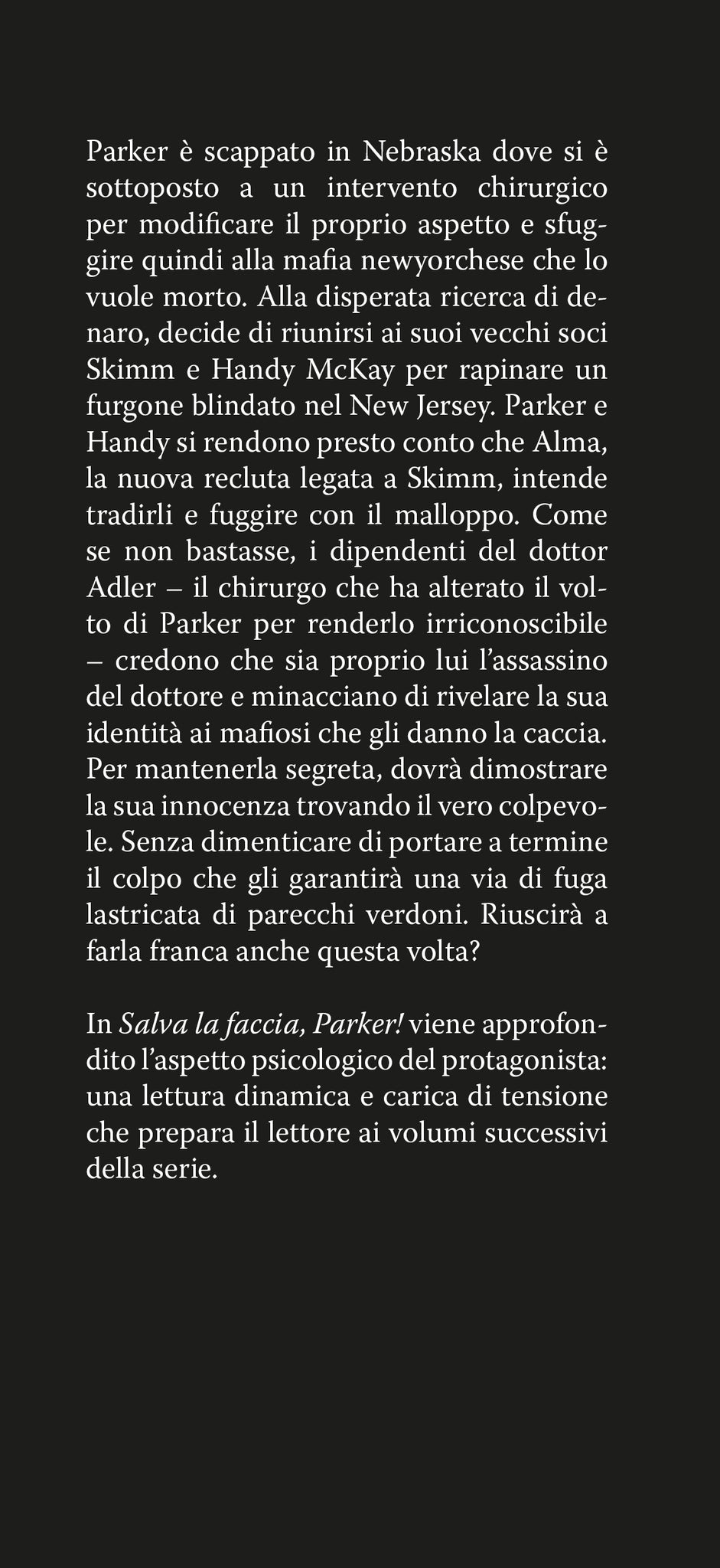 In Salva la faccia, Parker! viene approfondito l’aspetto psicologico del protagonista: una lettura dinamica e carica di tensione che prepara il lettore ai volumi successivi della serie.